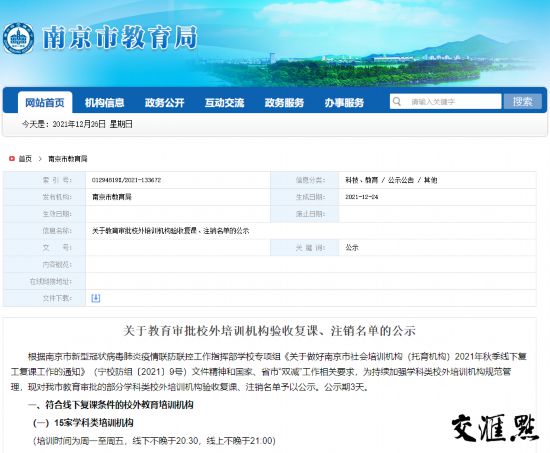 交匯點(diǎn)訊 今天,南京市教育局發(fā)布了“關(guān)于教育審批校外培訓(xùn)機(jī)構(gòu)驗(yàn)收復(fù)課、注銷(xiāo)名單的公示”,18家教培機(jī)構(gòu)注銷(xiāo)學(xué)科辦學(xué)資質(zhì)。