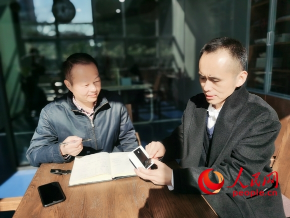 蘇州九正無線充電創(chuàng)始人許江(左)與合伙人討論下一步計劃。人民網記者 王繼亮攝