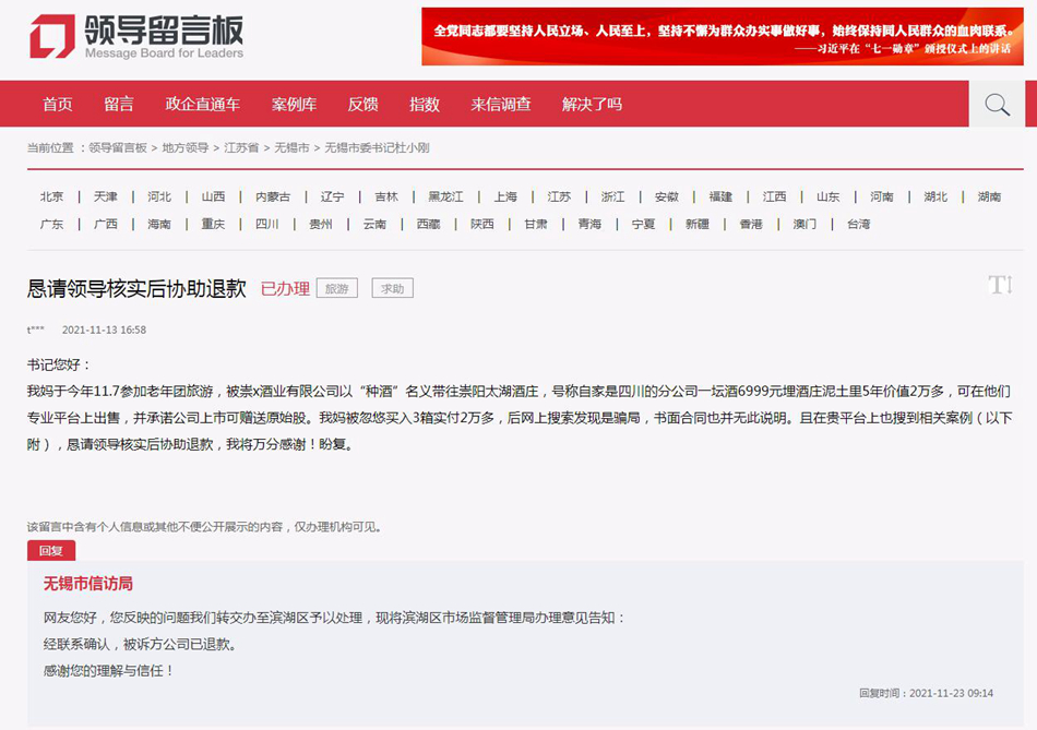 不久前,上海網(wǎng)友田女士的家人在人民網(wǎng)“領(lǐng)導(dǎo)留言板”上反映,田女士11月7日參加江蘇無錫老年團旅游中被帶往一家酒莊,對方號稱“一壇酒6999元埋酒莊泥土里5年價值2萬多”,并承諾在公司上市后贈送原始股。田女士花費2萬多元買下3份白酒,家人質(zhì)疑酒莊銷售手段遂要求退款。無錫市濱湖區(qū)市場監(jiān)管局介入處理后,涉事酒企已經(jīng)退款。