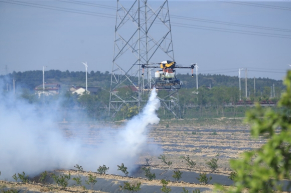 5G無人機(jī)在溧水?dāng)?shù)字農(nóng)場噴灑藥劑。江蘇移動供圖