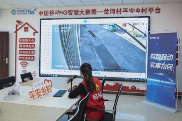 岔河村網(wǎng)格員通過“平安鄉(xiāng)村”智能監(jiān)控網(wǎng)絡(luò)查看道路實時情況。江蘇移動供圖