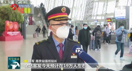 南京站值班站長(zhǎng)胡軍說(shuō):“一共是開(kāi)行402.5對(duì)列車(chē),其中我們南京站是130對(duì),全站客發(fā)今天預(yù)計(jì)在19萬(wàn)人左右。”