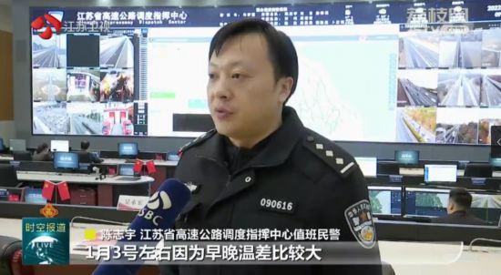 江蘇省高速公路調(diào)度指揮中心值班民警陳志宇說(shuō):“1月3號(hào)左右因?yàn)樵缤頊夭畋容^大,濕度比較高,可能會(huì)出現(xiàn)濃霧天氣,請(qǐng)大家在出行的時(shí)候,控制好車(chē)速。”