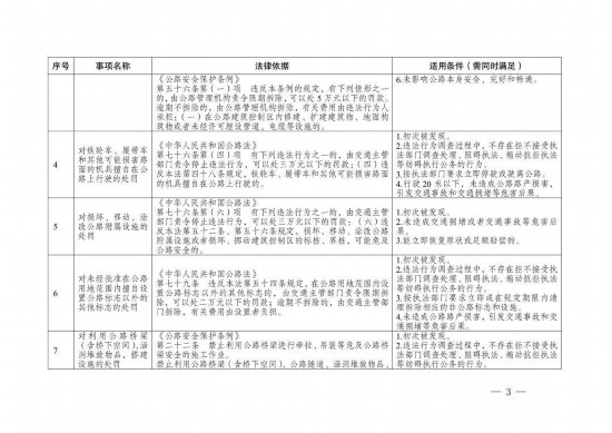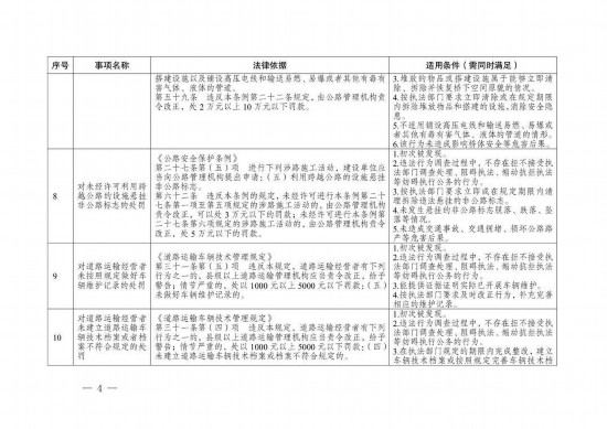 記者注意到,此次公布的40項清單涉及道路運輸、水上交通、港口、交通工程建設(shè)等多個領(lǐng)域,包括對在公路及公路用地范圍內(nèi)擺攤設(shè)點、堆放物品,影響公路暢通的處罰;對將公路作試車場地的處罰;對在公路建筑控制區(qū)內(nèi)修建建筑物、地面構(gòu)筑物的處罰;對未經(jīng)許可利用跨越公路的設(shè)施懸掛非公路標志的處罰;對出租汽車駕駛員不按照規(guī)定使用標志牌、標志燈、計價器、IC卡刷卡器 以及有關(guān)信息化管理設(shè)施,不按照規(guī)定主動向乘客出具合法有效的票據(jù)的處罰等等。