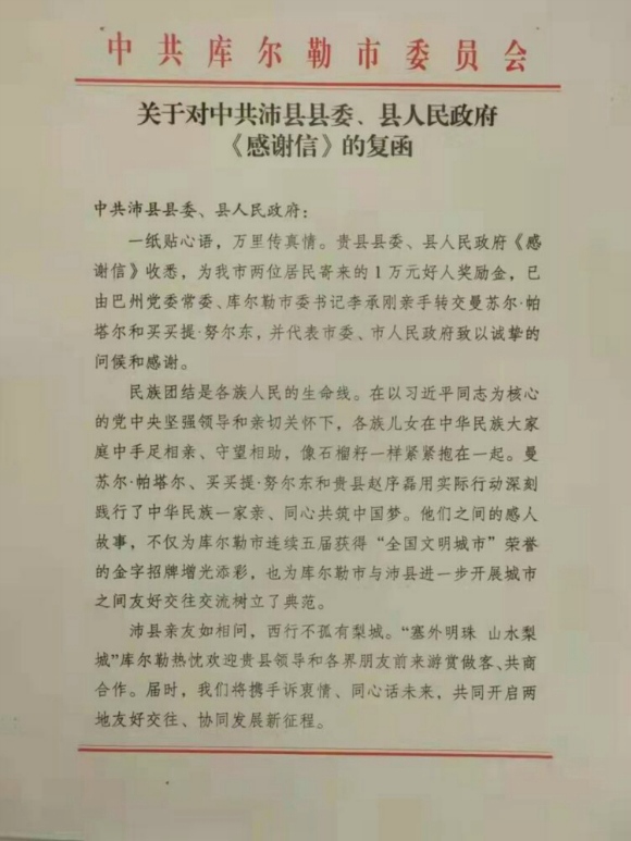 沛縣縣委、縣政府獲悉此事后十分重視,1月2日,以沛縣縣委、縣政府的名義,給新疆維吾爾自治區(qū)庫爾勒市委、市政府發(fā)去了一封感謝信,并從沛縣“好人基金”中拿出1萬元獎(jiǎng)金,請(qǐng)庫爾勒市委、市政府轉(zhuǎn)交給曼蘇爾·帕塔爾和買買提·努爾東兩人,以獎(jiǎng)勵(lì)二人的善行之舉,這才有了本文開頭庫爾勒市給沛縣回應(yīng)“感謝信”復(fù)函那一幕。