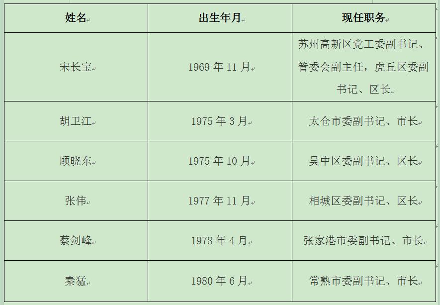簡歷顯示,宋長寶曾任蘇州市委辦公室副主任,高新區(qū)黨工委委員、虎丘區(qū)委常委、宣傳部長、統(tǒng)戰(zhàn)部長;胡衛(wèi)江曾任蘇州市委組織部副部長、蘇州市公務員局局長,太倉市委副書記(正處級)兼市委黨校校長、市行政學校校長;顧曉東曾任太倉市委常委、副市長,吳中區(qū)委副書記、區(qū)政府副區(qū)長、黨組副書記、區(qū)委黨校校長(兼);張偉曾任蘇州市政府副秘書長、市政府辦公室黨組成員,蘇州市住建局局長、黨組書記;蔡劍峰曾任蘇州市工業(yè)和信息化局局長、蘇州市委副秘書長、辦公室主任;秦猛曾任南京大學科學技術(shù)處處長、先進技術(shù)研究院常務副院長、科研經(jīng)費管理中心主任,常熟市委副書記、市政府黨組副書記、副市長。