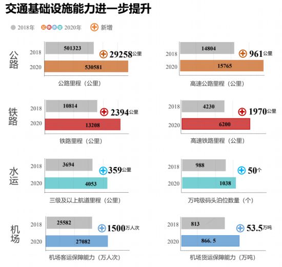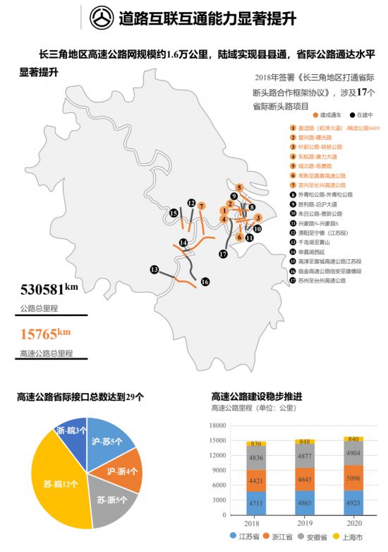 立體互聯(lián)的綜合交通網(wǎng)絡(luò)基本成型,省際連通水平不斷提升。在建設(shè)軌道上的長(zhǎng)三角方面,長(zhǎng)三角地區(qū)鐵路運(yùn)營(yíng)里程超過1.3萬公里,滬寧合杭之間基本實(shí)現(xiàn)高頻次1小時(shí)快速通達(dá)。省際間增加滬蘇通鐵路一期、商合杭鐵路、杭黃高鐵3個(gè)高鐵接口,總接口達(dá)到12個(gè);近三年新增高鐵約2300公里,高速鐵路里程超6500公里(占全國16%),覆蓋區(qū)域內(nèi)95%以上的設(shè)區(qū)市。在提升道路互聯(lián)互通能力方面,2018年三省一市簽署了《長(zhǎng)三角地區(qū)打通省際斷頭路合作框架協(xié)議》,協(xié)議設(shè)定目標(biāo)已全部完成,17個(gè)省際斷頭路項(xiàng)目全部開工建設(shè),其中建成通車7條,10條在建。省際間增加宜興至長(zhǎng)興高速、常熟至嘉興高速2個(gè)高速公路接口,總接口數(shù)量達(dá)到29個(gè);近三年新增高速公路約960公里,高速公路網(wǎng)規(guī)模達(dá)到1.6萬公里,陸域?qū)崿F(xiàn)縣縣通,省際公路通達(dá)水平顯著提升,長(zhǎng)三角地區(qū)69個(gè)高速公路省界收費(fèi)站全部取消。在協(xié)同推進(jìn)省際航道方面,長(zhǎng)三角地區(qū)高等級(jí)航道網(wǎng)規(guī)模超4000公里,三年來新增三級(jí)及以上航道里程359公里,初步建成以長(zhǎng)江、京杭運(yùn)河等為骨干的干線航道網(wǎng)絡(luò),通江達(dá)海的水運(yùn)格局初步形成。在過江通道建設(shè)方面,目前上海、江蘇、安徽長(zhǎng)江斷面累計(jì)建成過江通道27座,基本實(shí)現(xiàn)隔江相望的設(shè)區(qū)市之間過江通道直連。近三年共建成滬蘇通長(zhǎng)江公鐵大橋、五峰山過江通道、南京江心洲長(zhǎng)江大橋、池州長(zhǎng)江公路大橋、商合杭蕪湖長(zhǎng)江公鐵大橋5座過江通道。