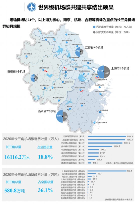 樞紐定位和能級(jí)進(jìn)一步提升。在世界級(jí)機(jī)場(chǎng)群共建共享結(jié)方面,長(zhǎng)三角地區(qū)目前共有運(yùn)輸機(jī)場(chǎng)24個(gè),地面距離100千米覆蓋94%的縣級(jí)節(jié)點(diǎn)和96%的人口,以上海為核心,南京、杭州、合肥等機(jī)場(chǎng)為重點(diǎn)的長(zhǎng)三角機(jī)場(chǎng)群初具規(guī)模。機(jī)場(chǎng)群布局不斷完善,蕪宣機(jī)場(chǎng)、連云港花果山機(jī)場(chǎng)建成運(yùn)營(yíng),新建及改擴(kuò)建浦東國際機(jī)場(chǎng)、南京祿口機(jī)場(chǎng)、杭州蕭山國際機(jī)場(chǎng)、阜陽機(jī)場(chǎng)等17個(gè)機(jī)場(chǎng),南通新機(jī)場(chǎng)、嘉興機(jī)場(chǎng)項(xiàng)目、大場(chǎng)機(jī)場(chǎng)遷建、亳州機(jī)場(chǎng)、蚌埠機(jī)場(chǎng)等5個(gè)機(jī)場(chǎng)前期工作穩(wěn)步推進(jìn)。長(zhǎng)三角地區(qū)航線聯(lián)通全球約50個(gè)國家及國內(nèi)重要城市,機(jī)場(chǎng)旅客吞吐量和貨郵吞吐量在全國占比分別達(dá)到19%和36%。在世界級(jí)港口群協(xié)同建設(shè)方面,滬蘇共同推動(dòng)通州灣新出?诮ㄔO(shè),滬浙合作推進(jìn)小洋山區(qū)域開發(fā),滬皖合作共建蚌埠港內(nèi)河集裝箱碼頭等。目前萬噸級(jí)及以上泊位超1000個(gè),三年來新增50個(gè),港口貨物吞吐量占全國比重高達(dá)42%,長(zhǎng)三角地區(qū)現(xiàn)擁有17個(gè)億噸大港,其中上海港、寧波舟山港、蘇州港貨物吞吐量排名位列全球前十名。