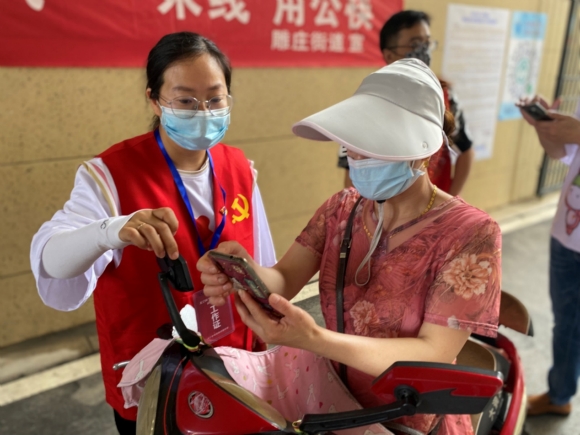 天寧北網(wǎng)格黨員在鳳凰熙岸小區(qū)引導(dǎo)用戶進(jìn)行核酸檢測登記。江蘇移動供圖