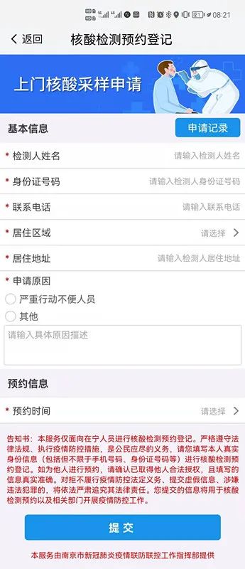 方式四:嚴(yán)重行動(dòng)不便人員,可通過(guò)“我的南京”APP→“核酸檢測(cè)”進(jìn)行申請(qǐng),審核通過(guò)后提供上門(mén)采樣服務(wù)(本次演練不進(jìn)行實(shí)際上門(mén)采樣)。點(diǎn)擊“上門(mén)核酸采樣申請(qǐng)”,進(jìn)入登記頁(yè)面,填寫(xiě)基本信息及預(yù)約信息,點(diǎn)擊“提交”完成預(yù)約登記。溫馨提示:為確保申請(qǐng)審核通過(guò),請(qǐng)務(wù)必詳細(xì)填寫(xiě)申請(qǐng)?jiān)虿⑻峁?zhǔn)確的聯(lián)系電話和居住地址。
