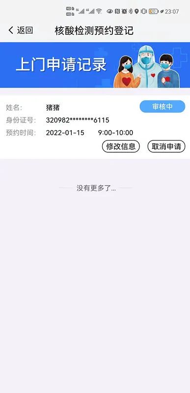 答:可以。本人可通過(guò)“我的南京”APP(其他路徑暫不支持)→“核酸檢測(cè)”→“核酸檢測(cè)預(yù)約”,進(jìn)入核酸檢測(cè)預(yù)約登記系統(tǒng),在“預(yù)約結(jié)果查詢”模塊內(nèi)點(diǎn)擊“修改信息”進(jìn)行修改。