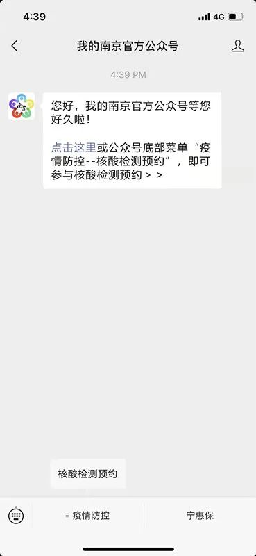 1.通過(guò)微信關(guān)注“我的南京官方公眾號(hào)”,點(diǎn)擊自動(dòng)回復(fù)鏈接,或底部菜單“疫情防控”→“核酸檢測(cè)預(yù)約”參與預(yù)約;