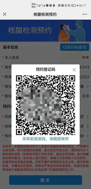 通過(guò)上述三種方式進(jìn)入“個(gè)人預(yù)約登記”頁(yè)面后,填寫(xiě)基本信息及預(yù)約信息,點(diǎn)擊“提交”完成預(yù)約,系統(tǒng)會(huì)生成預(yù)約登記碼,請(qǐng)及時(shí)進(jìn)行截圖保存。重新進(jìn)入預(yù)約登記頁(yè)面后可重復(fù)上述步驟替他人進(jìn)行預(yù)約。