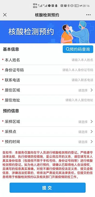 在寧人員可通過(guò)方式一至三進(jìn)行核酸檢測(cè)預(yù)約登記,嚴(yán)重行動(dòng)不便人員可通過(guò)方式四進(jìn)行預(yù)約登記,審核通過(guò)后提供上門(mén)采樣服務(wù)(本次演練不進(jìn)行實(shí)際上門(mén)采樣)。
