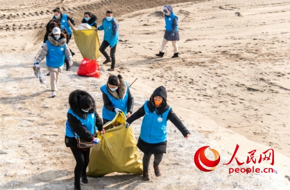 圓陀角黃金海灘景區(qū),凜冽寒風(fēng)中,身著藍(lán)色外套的環(huán)境保護(hù)志愿者們一手拿著垃圾袋,一手持著垃圾夾,仔細(xì)拾撿著被海浪沖在沙灘上的飲料瓶、塑料袋等海洋垃圾,耐心地分類裝入不同的器皿中。在天空和大海的映襯下,這些志愿者身上的藍(lán)色顯得格外純凈。