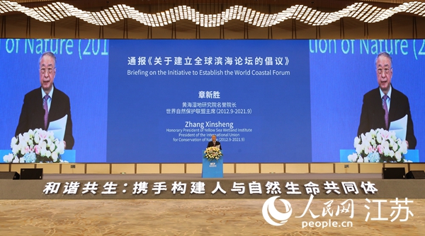 濱海論壇上,世界自然保護聯(lián)盟前主席、黃海濕地研究院名譽院長章新勝通報《關于建立全球濱海論壇的倡議》。郜野喬攝