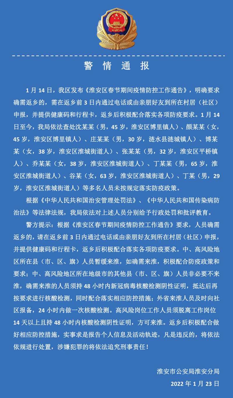 人民網(wǎng)南京1月23日電 (馬曉波)1月23日,據(jù)淮安市淮安區(qū)警方通報,在1月14日《淮安區(qū)春節(jié)期間疫情防控工作通告》發(fā)布以來,該區(qū)多名人員因未按規(guī)定落實“確需返鄉(xiāng)的,需在返鄉(xiāng)前3日內(nèi)通過電話或由親朋好友到所在村居(社區(qū))申報,并提供健康碼和行程卡,返鄉(xiāng)后積極配合落實各項防疫要求”的防疫政策,受到警方行政處罰和批評教育。