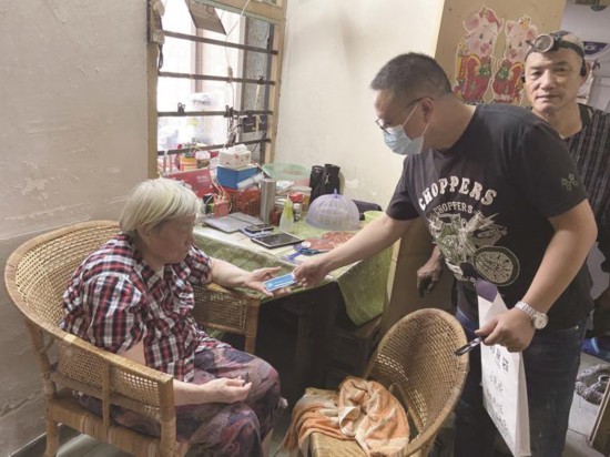 適老化改造施工人員向老人發(fā)放保修聯(lián)系卡。(資料圖片) 王銳泌攝