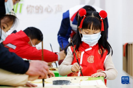 1月22日,在泗洪縣瑤溝鄉(xiāng)官塘社區(qū)新時代文明實踐站,參加愛心托管班的小朋友練習書法。