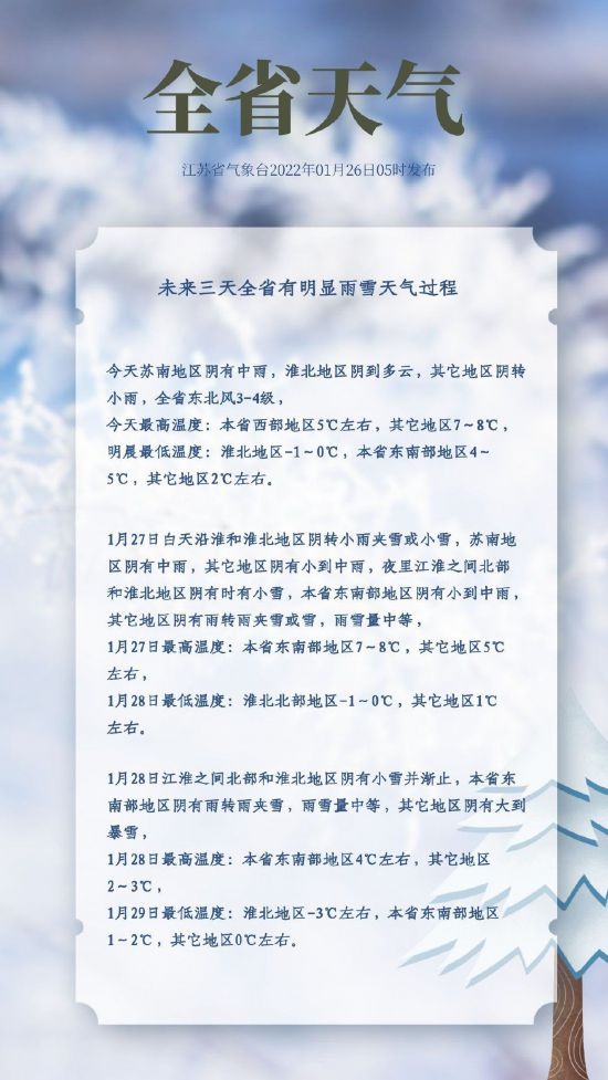 據(jù)最新氣象資料分析,受冷暖氣流共同影響,25-29日我省將有持續(xù)雨雪天氣,25-26日以降雨為主,27-29日降水相態(tài)將轉(zhuǎn)為雨夾雪或雪,其中27日夜間至28日淮河以南中西部地區(qū)(南京鎮(zhèn)江揚(yáng)州等地)將有大到暴雪,局部大暴雪。