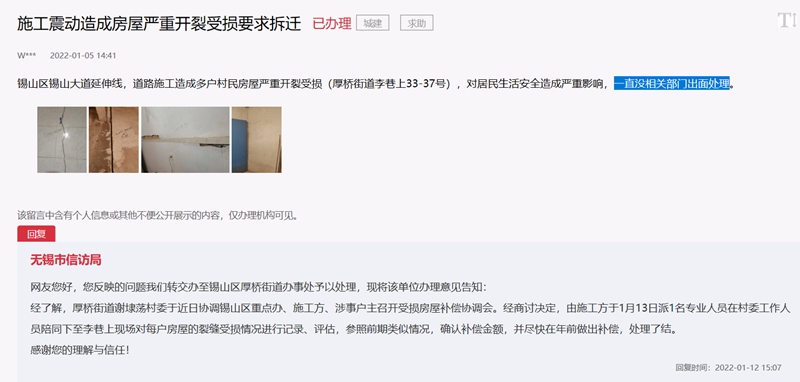 2020年該項(xiàng)目停工半年,當(dāng)年底再開工后震動(dòng)依舊。2022年1月5日,鄒先生在人民網(wǎng)“領(lǐng)導(dǎo)留言板”向無(wú)錫市委書記杜小剛留言求助,事情很快得到回復(fù)。1月12日,無(wú)錫市信訪局回應(yīng)稱,厚橋街道謝埭蕩村委將協(xié)調(diào)錫山區(qū)重點(diǎn)工程建設(shè)管理辦公室、施工方、涉事戶主召開受損房屋補(bǔ)償協(xié)調(diào)會(huì)。