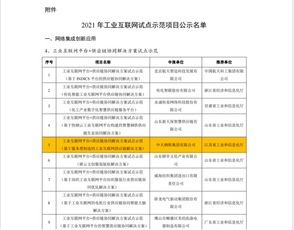 工信部2021年工業(yè)互聯(lián)網(wǎng)試點(diǎn)示范項(xiàng)目公示名單截圖。中天鋼鐵供圖