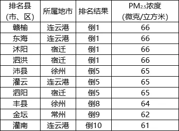 PM2.5濃度相對較差的后10位(倒1-10名)依次是:贛榆(東海、沭陽、泗洪并列)、沛縣(灌云、泗陽并列)、豐縣、金壇、灌南。