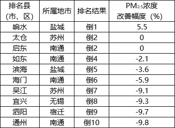 PM2.5濃度改善幅度相對較差的后10位(倒1-10名)依次是:響水、太倉(啟東并列)、如東、濱海、海門、吳江、宜興、泗陽、通州。