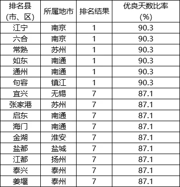 優(yōu)良天數(shù)比率相對較好的前10位(1-10名)依次是:江寧(六合、常熟、如東、通州、句容并列)、宜興(張家港、啟東、海門、金湖、鹽都、江都、泰興、姜堰并列)。