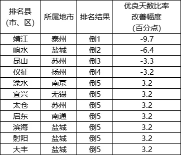 優(yōu)良天數(shù)比率改善幅度相對較差的后10位(倒1-10名)依次是:靖江、響水、昆山、儀征、溧水(宜興、太倉、啟東、濱海、射陽、大豐并列)。