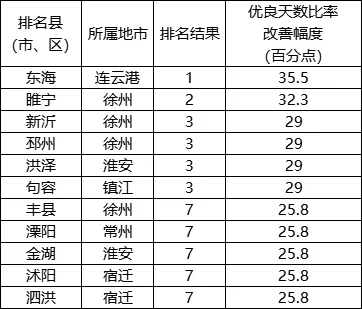 優(yōu)良天數(shù)比率改善幅度相對較好的前10位(1-10名)依次是:東海、睢寧、新沂(邳州、洪澤、句容并列)、豐縣(溧陽、金湖、沭陽、泗洪并列)。