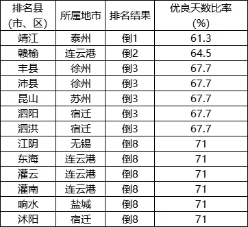 優(yōu)良天數(shù)比率相對較差的后10位(倒1-10名)依次是:靖江、贛榆、豐縣(沛縣、昆山、泗陽、泗洪并列)、江陰(東海、灌云、灌南、響水、沭陽并列)。