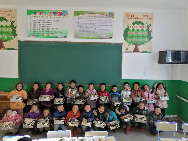 青海玉樹(shù)州曲麻萊縣小學(xué)生收到連云港愛(ài)心市民捐助的愛(ài)心棉鞋。海州區(qū)委宣傳部供圖