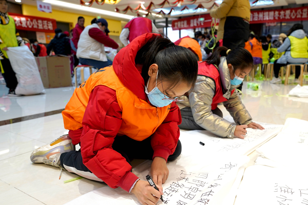 學(xué)生志愿者認(rèn)真書(shū)寫(xiě)捐贈(zèng)冬衣郵寄信息。海州區(qū)委宣傳部供圖