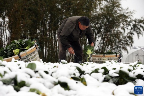 1月29日,在浙江省湖州市德清縣乾元鎮(zhèn)聯(lián)星村蔬菜基地,農(nóng)民在雪中搶收蔬菜。