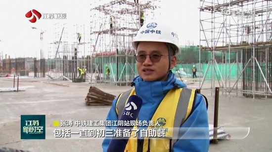 中鐵建工集團(tuán)江陰站現(xiàn)場負(fù)責(zé)人張濤說:“我們江陰站工人大概有200余人,我們項目部也是從除夕夜包括一直到初三準(zhǔn)備了自助餐,我們生活區(qū)食堂包括我們宿舍是張燈結(jié)彩,讓工人也體會到過年的喜悅!