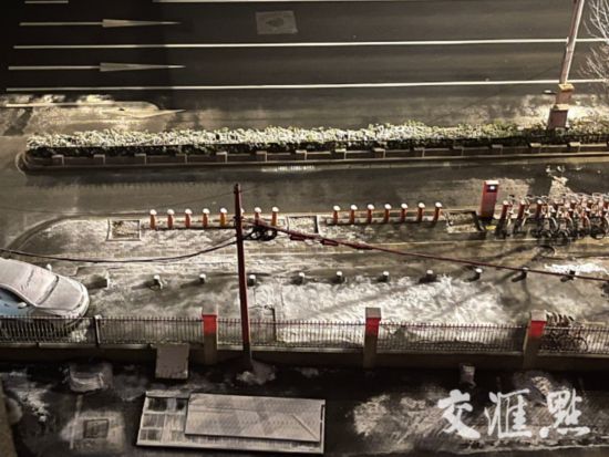 5點37分,記者打開窗時看到,南京市鼓樓區(qū)地面已經(jīng)形成明顯積雪,汽車表面已經(jīng)完全被雪覆蓋,路燈下的飄雪形態(tài)明顯。