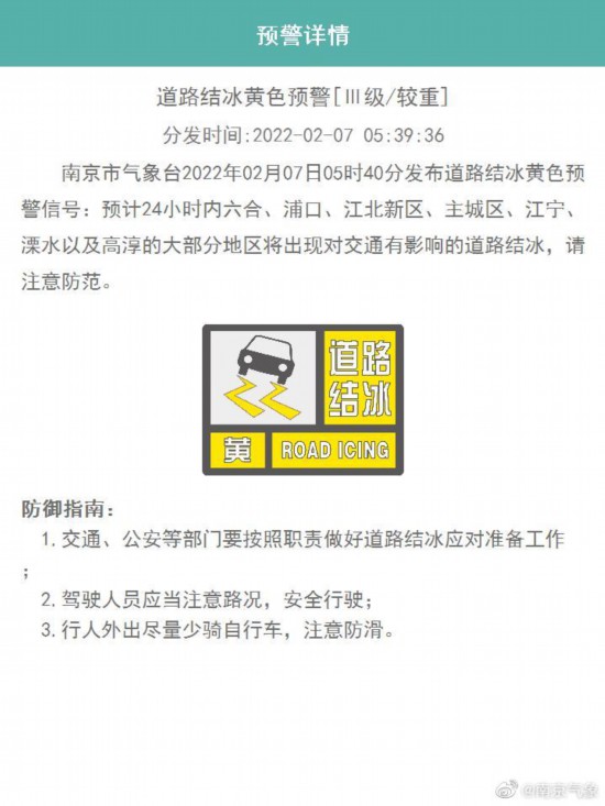 5時40分,南京市氣象臺緊接著又發(fā)布了道路結(jié)冰黃色預警信號:預計24小時內(nèi)六合、浦口、江北新區(qū)、主城區(qū)、江寧、溧水以及高淳的大部分地區(qū)將出現(xiàn)對交通有影響的道路結(jié)冰,請注意防范。