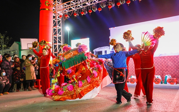 2月6日晚,江蘇沭陽縣錢集鎮(zhèn)老嚴蕩村農(nóng)民集中居住的小區(qū)里熱鬧非凡。村民們在大篷車舞臺上或搖動花船,或來一段淮海戲唱腔,或跳一個激情洋溢的廣場舞,來慶賀村里的文明新風表彰會。