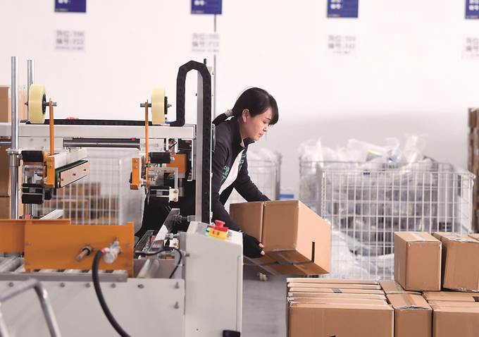 南京綜合保稅區(qū)(龍?zhí)叮,工作人員正在跨境電商保稅貨物打包區(qū)域打包貨品。 本報(bào)記者 邵丹 攝