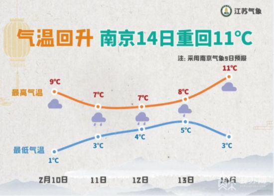 溫度方面,呈波動回升趨勢。以南京為例,11和12日有小幅度下降,最高氣溫在7℃左右。14日回升至11℃。