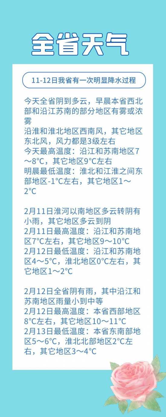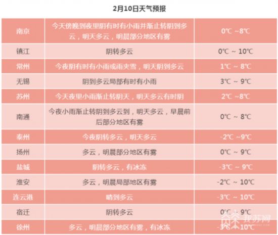 今天全省陰到多云,早晨本省西北部和沿江蘇南的部分地區(qū)有霧或濃霧,沿淮和淮北地區(qū)西南風,其它地區(qū)東北風,風力都是3級左右,今天最高溫度:沿江和蘇南地區(qū)7~8℃,其它地區(qū)9℃左右,明晨最低溫度:淮北和江淮之間東部地區(qū)-1℃左右,其它地區(qū)1~2℃。