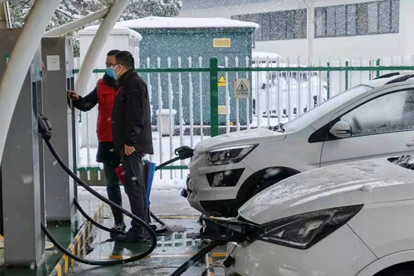 2月7日,國(guó)網(wǎng)南京電動(dòng)汽車服務(wù)有限公司運(yùn)維人員協(xié)助指導(dǎo)車主充電。吉穎攝