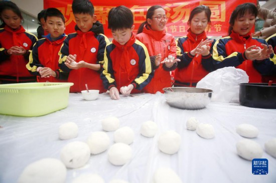 2月11日,在江蘇省揚州市春江社區(qū),小朋友們一起包湯圓。