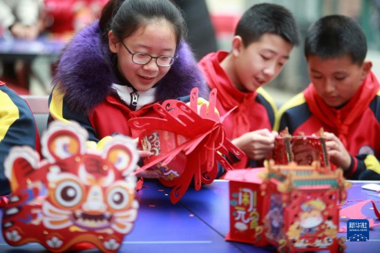 2月11日,在江蘇省揚(yáng)州市春江社區(qū),小朋友們?cè)谥谱骰簟?/p>