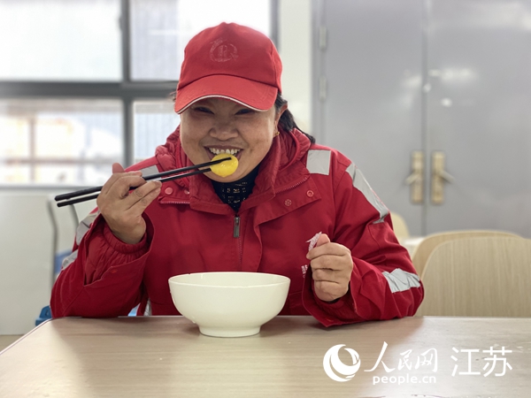 圖為一名環(huán)衛(wèi)工人在品嘗湯圓。鼓樓區(qū)城管局供圖