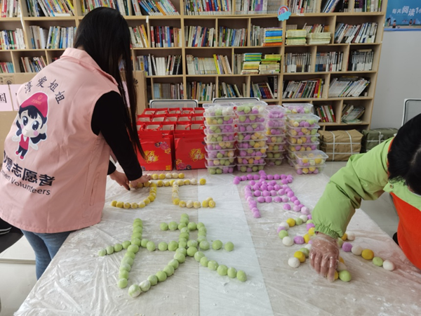 高淳“淳愛(ài)姐姐”巾幗志愿者將包好的元宵擺成“元宵快樂(lè)”字樣。劉雯攝