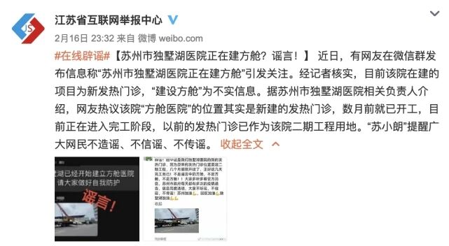 人民網(wǎng)南京2月17日電 (黃竹巖)近日,網(wǎng)傳蘇州市獨墅湖醫(yī)院正在建方艙,引發(fā)關(guān)注。2月16日晚,江蘇省互聯(lián)網(wǎng)舉報中心官方微博回應(yīng)稱,經(jīng)核實,獨墅湖醫(yī)院“建設(shè)方艙”為不實信息,目前該院在建的項目為新發(fā)熱門診。