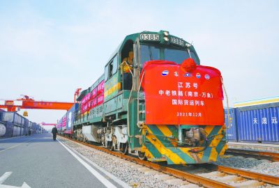 2021年12月8日,首趟“江蘇號”中老鐵路(南京—萬象)國際貨運(yùn)列車開行,這也是長三角開行的首趟中老鐵路國際貨運(yùn)列車。 南京日報(bào)/紫金山新聞記者 徐琦 通訊員 謝田 攝