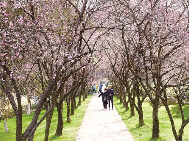 記者在玄武湖公園看到,湛藍(lán)天空與青青草地連成一片,梅花吐蕊,令人神清氣爽。園內(nèi)共有梅花2300余株,其中梅花隧道長度50米左右,種植了白梅、宮粉梅、玉蝶梅、綠萼梅、朱砂梅等品種,呈現(xiàn)出紅、綠、白等多種顏色,層次豐富!暗缆穬膳悦窐湎蚵分行纳L,樹枝抱合在一起,形成天然隧道,漫步其中,很是浪漫!”市民吳女士特意來“打卡”梅花隧道。